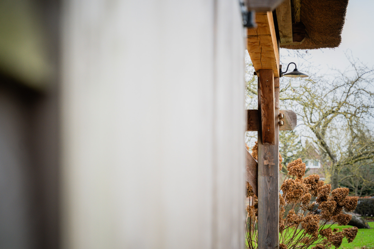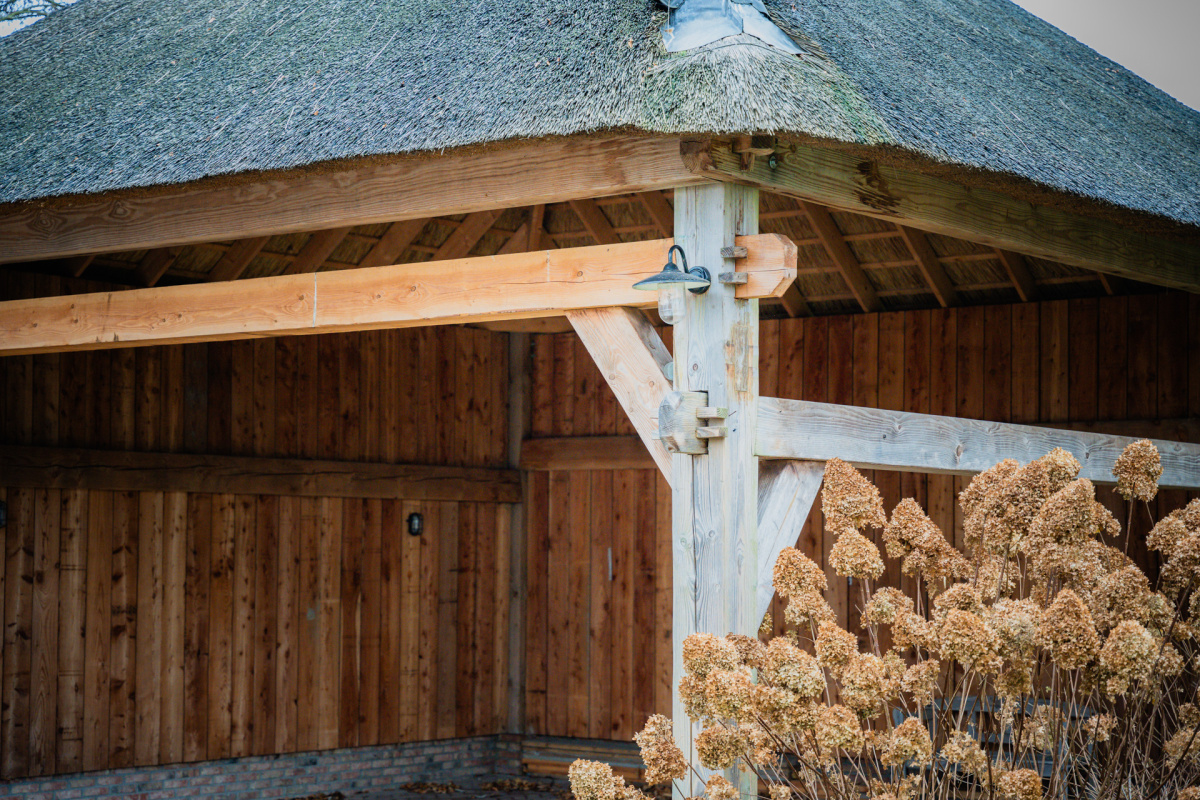 Bij een monumentale boerderij past lang niet elk bijgebouw. Daarom dachten we met de familie Knoll mee om een overkapping voor hun camper te combineren met praktische schuurruimte. In een sfeer die past in het historische straatbeeld. We kwamen uit op een hooischuur, met schitterende gebinten. Deze trokken we niet alleen qua constructie, maar in alle opzichten op van hout. Het leverde een plaatje op dat tot in detail tot de verbeelding spreekt. Exact volgens de bouwtekening, die we voor de vergunningsaanvraag maakten.